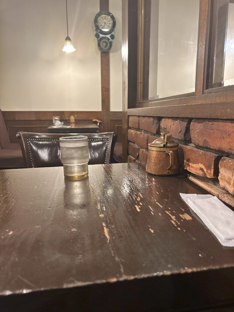 柱時計やペンダントライト、テーブルや椅子も年月を重ねている風格を感じる。