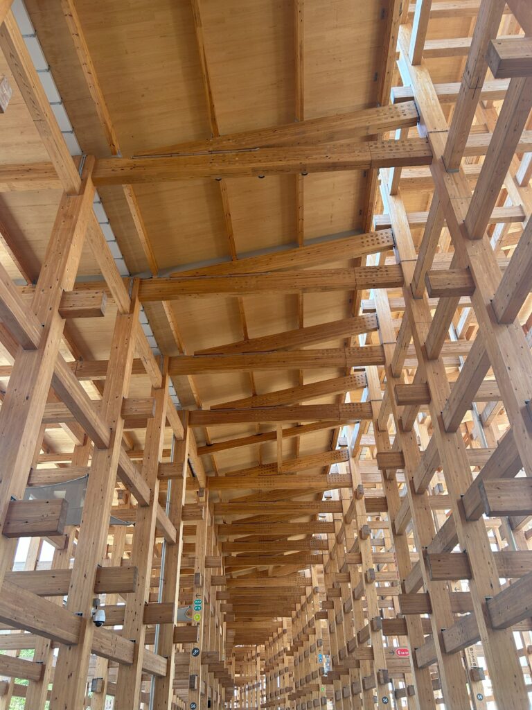 木材と木材の組まれている様子が緩やかなカーブの先へと続いていく。
