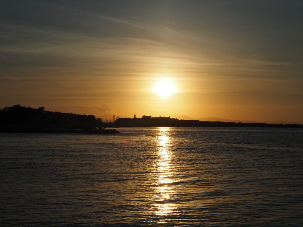 伊勢湾の揺らめく海面に伸びる光