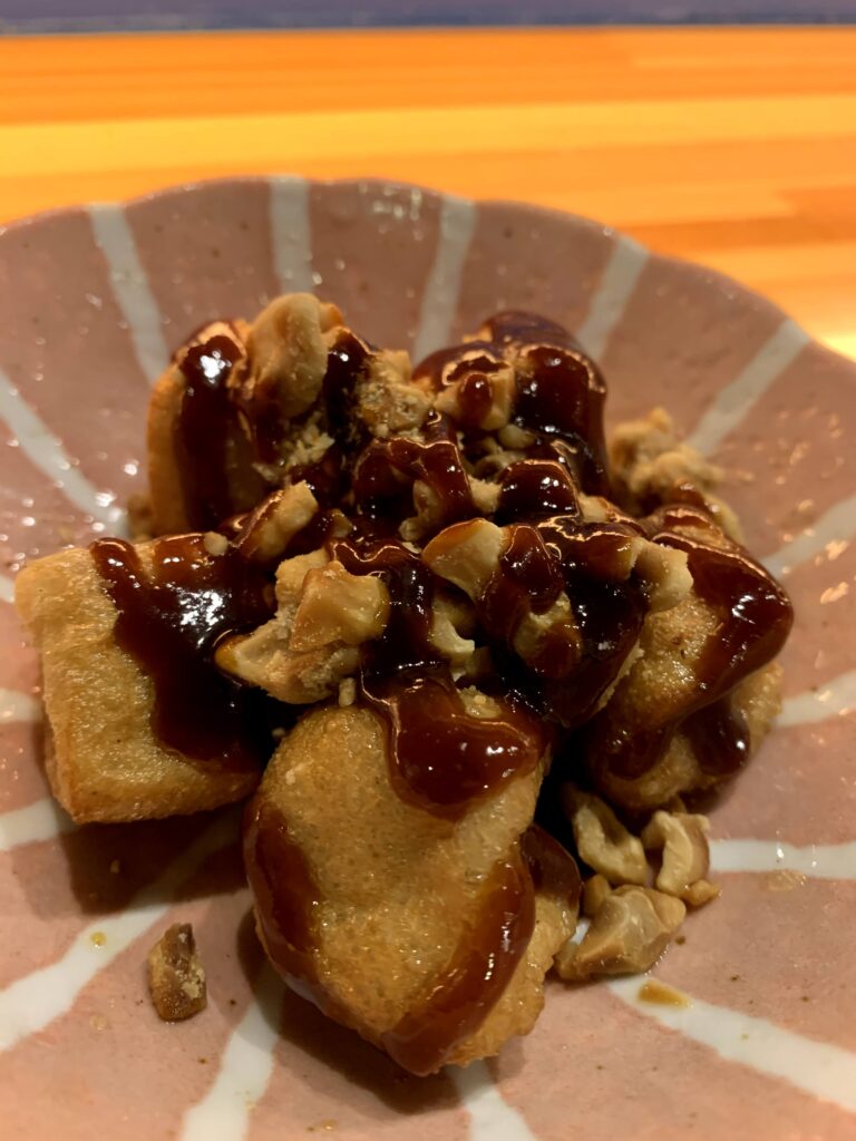 お麩とナッツをみそだれで和えたみたいなやつ。