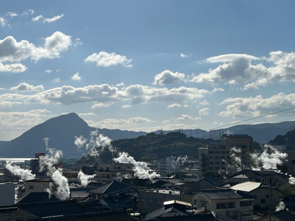 冬の日差しの中、温泉の湯気がいたるところから上がる。