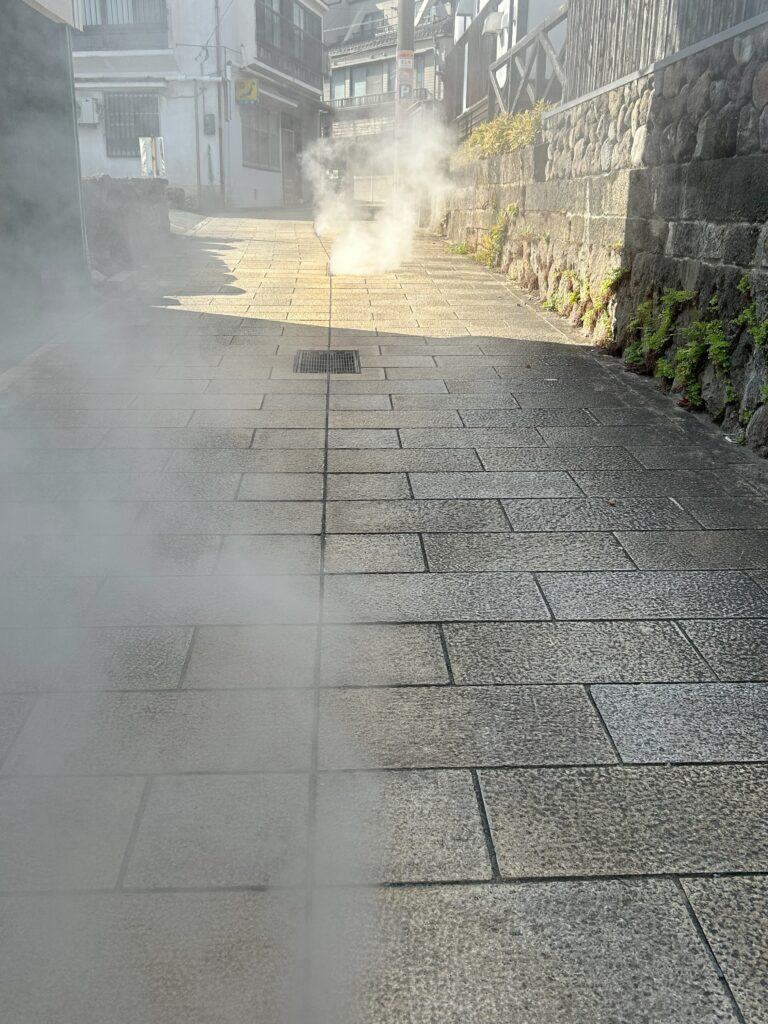 温泉街の方へ戻っていく。排水溝からも温泉の湯気がもうもうと上がっている。