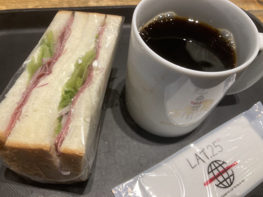 空港内のカフェで、サンドイッチとコーヒー。