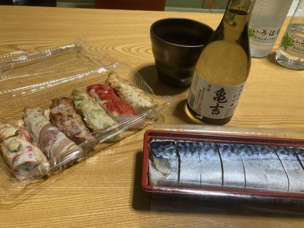 八食センターで買った、天ぷら(練り物)いろいろと、鯖の押し鮨。