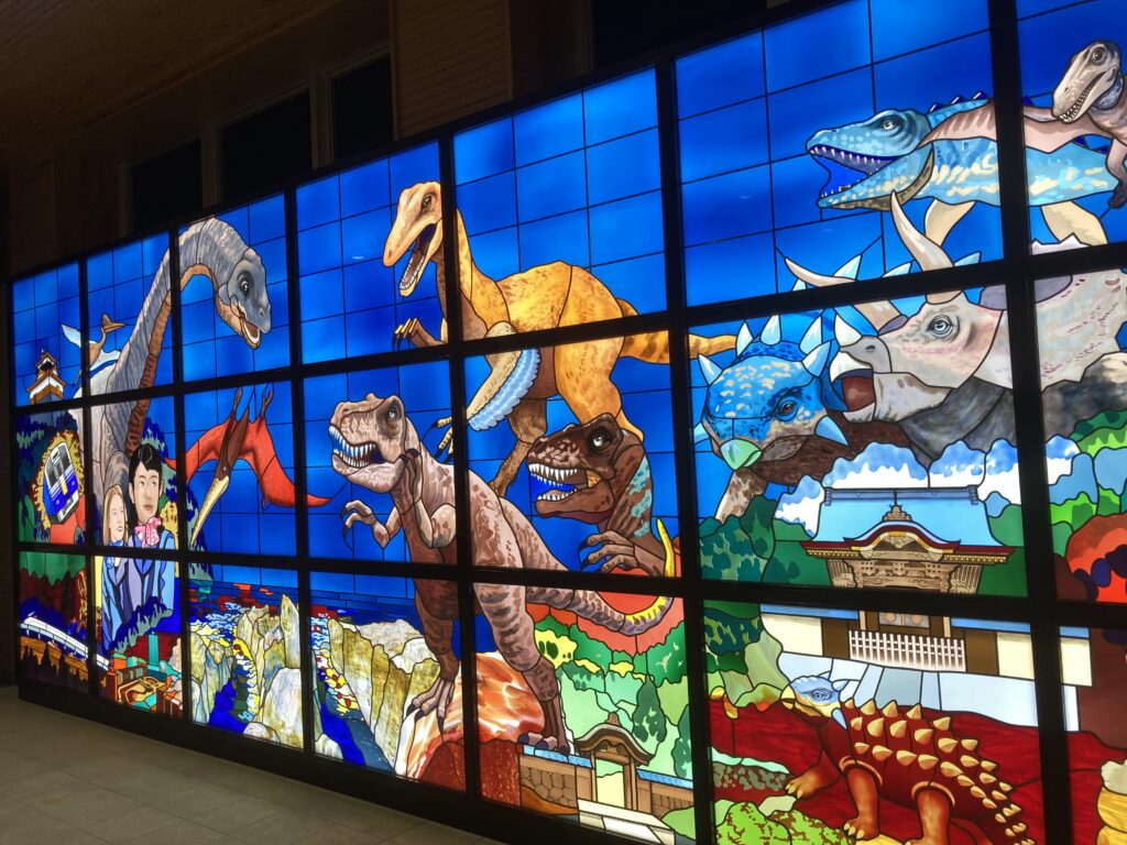 JRだけではなく、越前鉄道の駅舎にも恐竜のステンドグラスや、