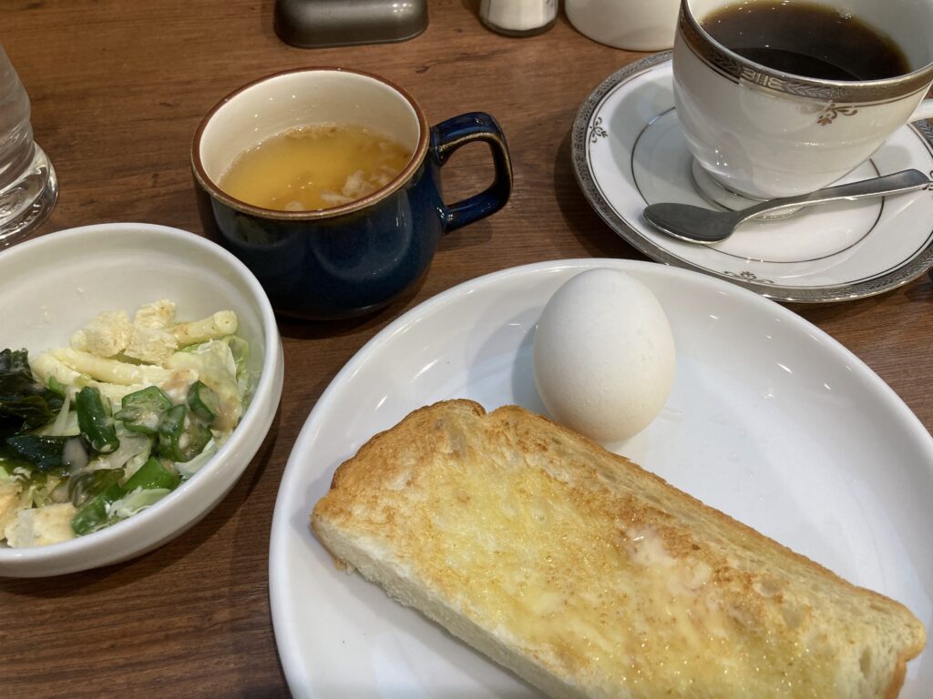 珈琲を頼むとモーニングセットがついてきて、さらに+30円でゆで卵がつけられる。