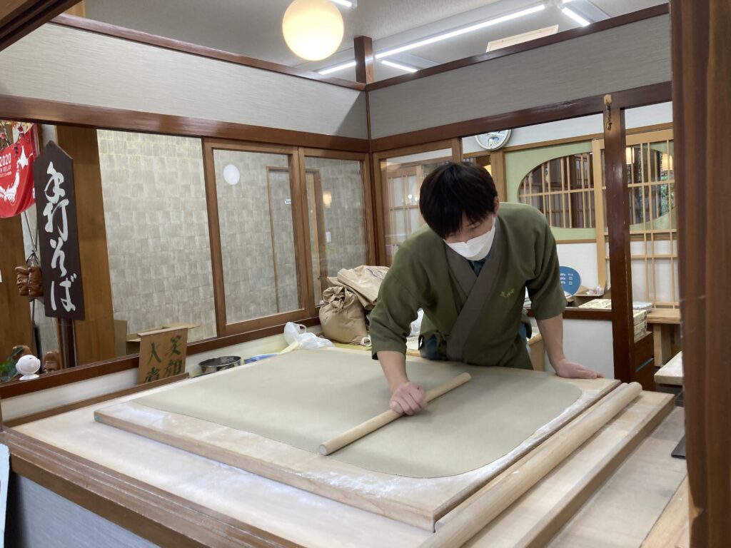 山楽亭。店頭では蕎麦打ちの様子が見られるようになっている。