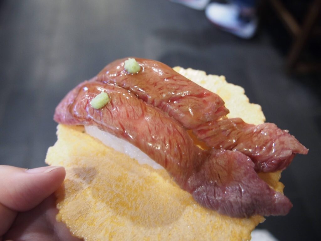 目の前で炙って脂がほんのり溶けたところをいただきます。
