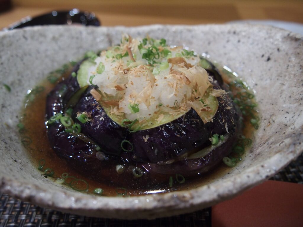 大きな丸茄子を丸ごと揚げてある。お箸で切れるとろとろになった茄子、そこにおいしいお出汁がしみ込んでそりゃもうおいしい。
