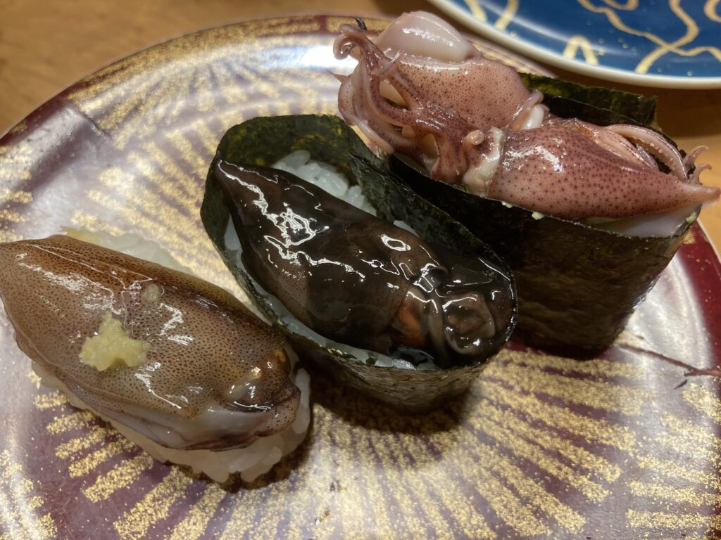 ホタルイカ3点盛。生ホタルイカ、黒作り、茹でホタルイカ。