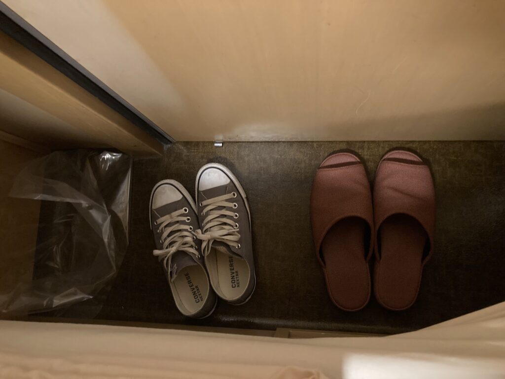 部屋にはスリッパやごみ用の袋、ハンガー、それに毛布、パジャマ、枕、紙コップがひとつ。