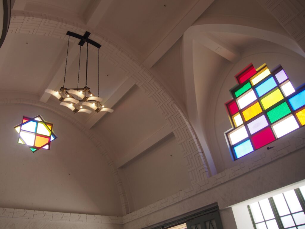 待合室のドーム天井に、照明とステンドグラスが可愛らしい。