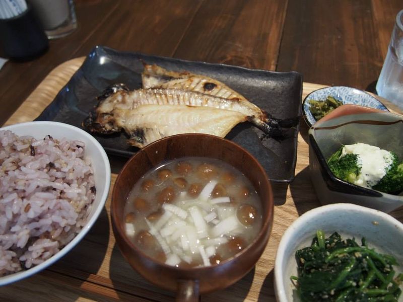 主役の焼き魚はもちろん、五穀ご飯もなめこ汁も小鉢も、すべてが体に優しいランチ。
