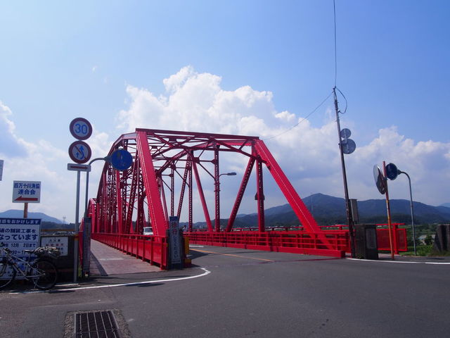 商店街を抜けて少し坂を上ったところで、赤い大きな橋が見えてきて急に視界が開ける。
