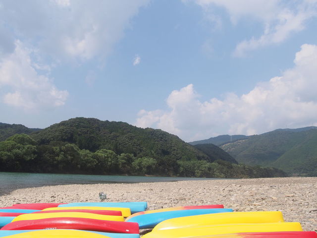 ここは河原が広くて、色とりどりのカヌーがあったり、ボートに乗っている親子連れがいたりした。