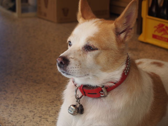 バスを待ちつつ、バス停前のお茶屋さんの看板わんこに話しかけてみる。