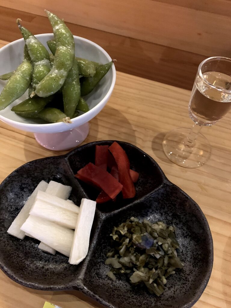 ランチを食べたばかりなので、軽めに漬物盛り合わせと枝豆。