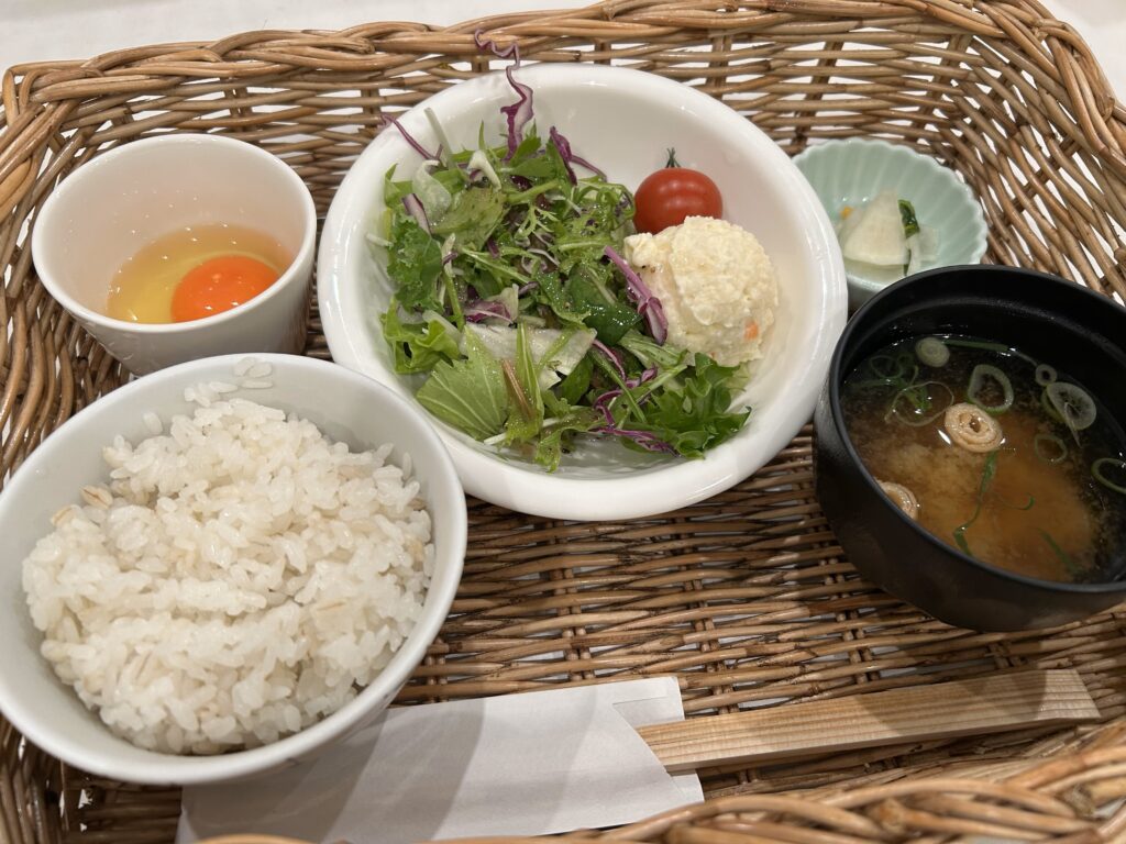 たまごかけごはんで朝ご飯。ご飯が玄米入りと白米から選べるのもうれしい。