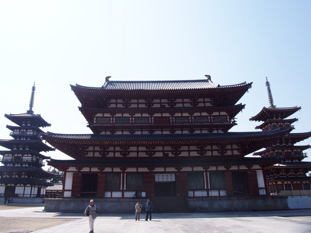 薬師寺。広い敷地内に鮮やかな建物。