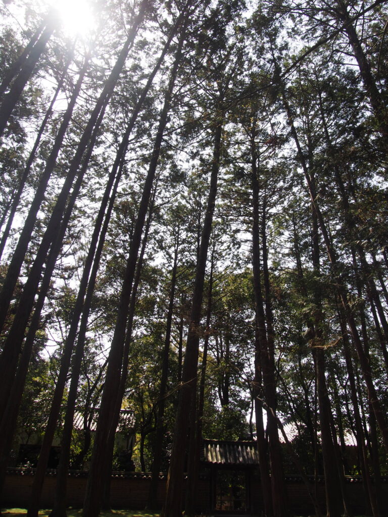 静かな敷地内、まっすぐに伸びる杉が気持ちよい。
