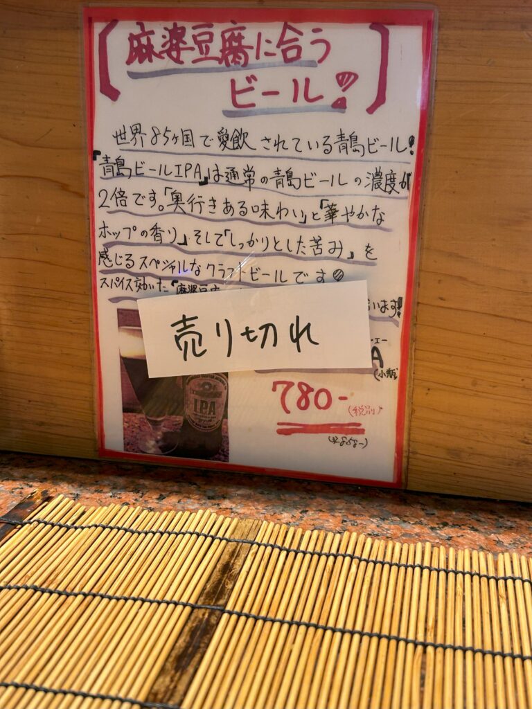 麻婆豆腐に合うビールにも惹かれたけど、残念ながら売り切れ。