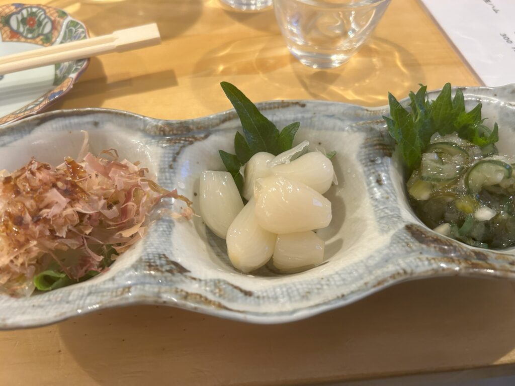 日本酒をいただきつつ、軽くつまみたいなと思ってお漬物を頼む。