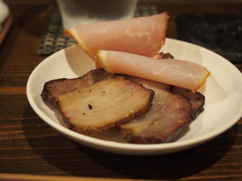 自家製の燻製が燗酒によく合う。