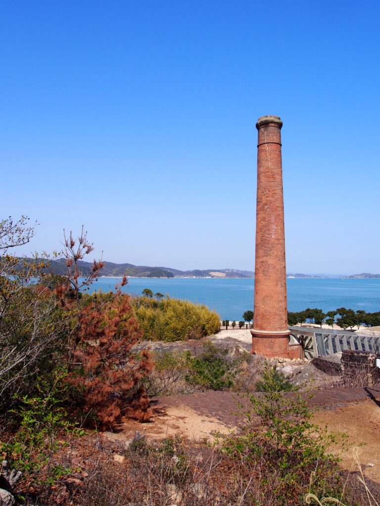 朽ちた精錬所の向こうには瀬戸内の美しい海が。