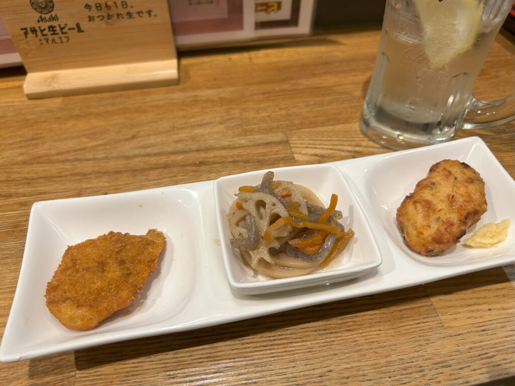 おつまみ3種盛は、鯵大葉フライ・きんぴら・豆腐のふんわり揚げ。
