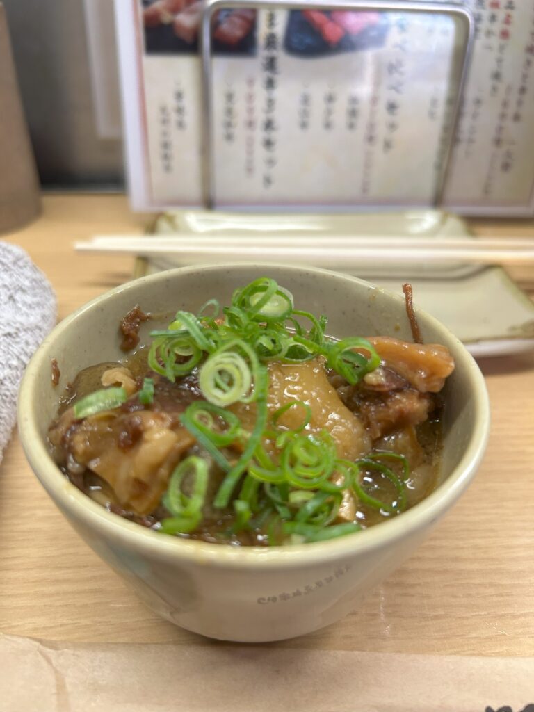 串が揚がるのを待っている間は、どて焼きをいただきます。濃厚で旨い。