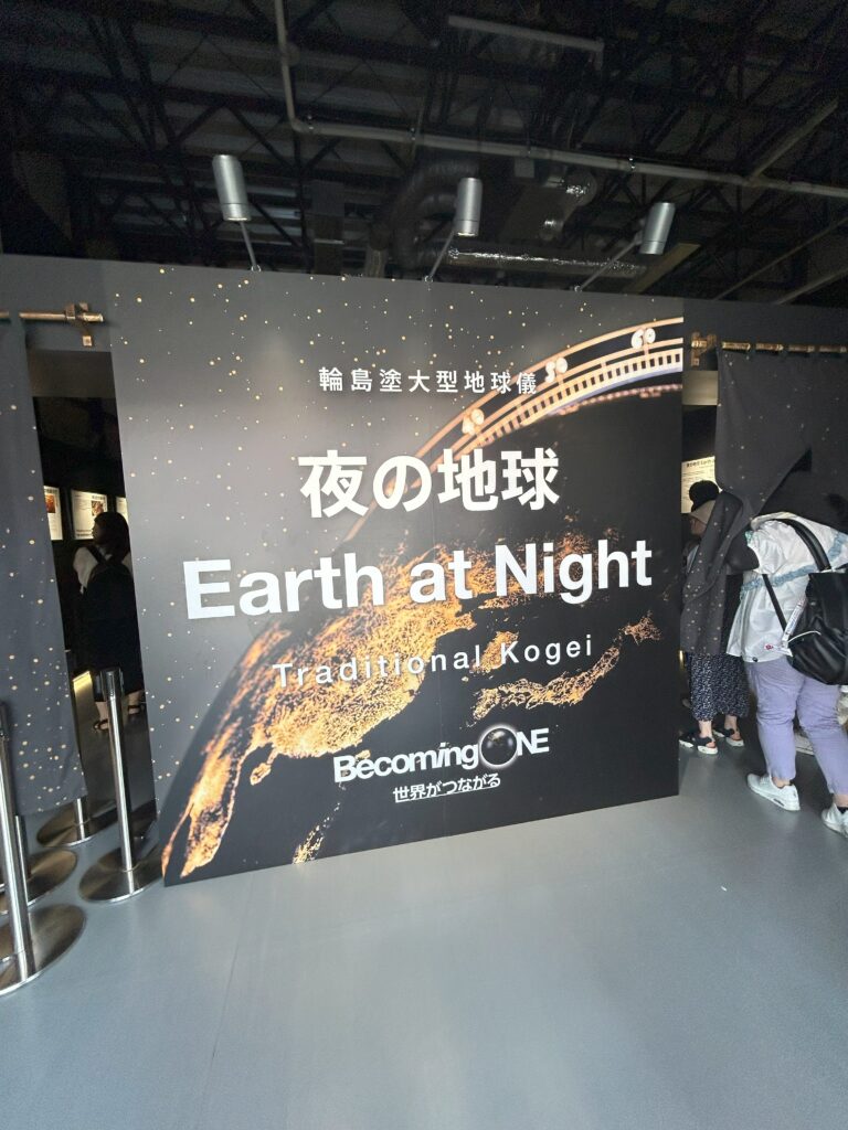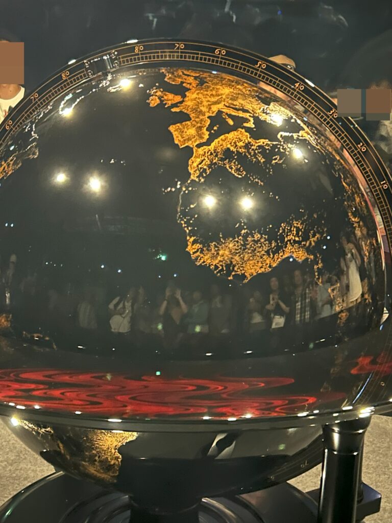 漆塗りで作られた地球儀に、人のいるところに灯りが金箔や金粉で表現されている。