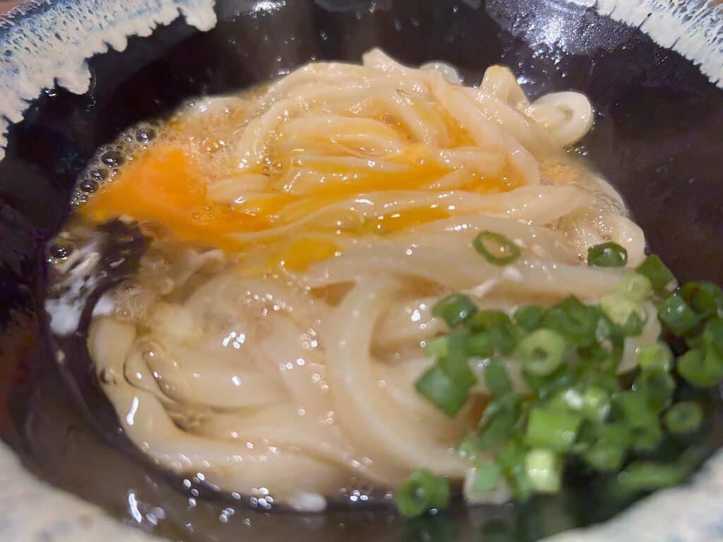 釜玉にした。お昼に食べたお店とはまた違って美味しい。