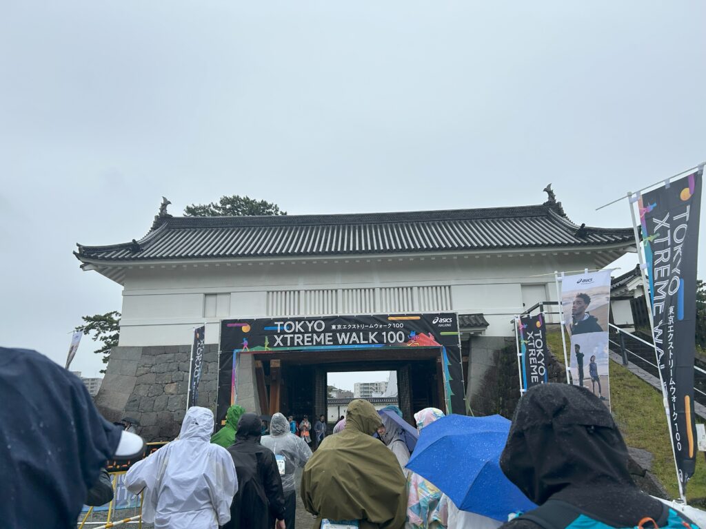 傘をさしたまま歩くか、レインウェアのフードのみで歩くか迷うが、他の参加者は傘をさしていない人の方が多そう。