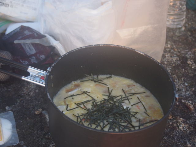 朝日に見とれている間に、ガイドさんが朝ごはんを作ってくれた。