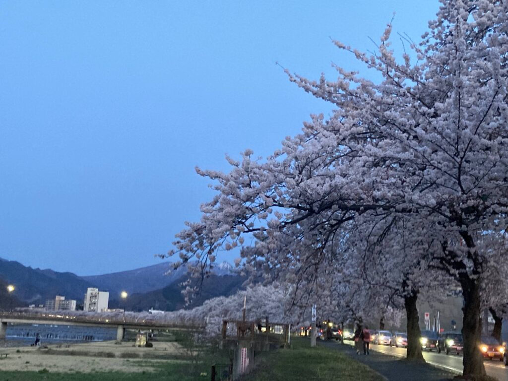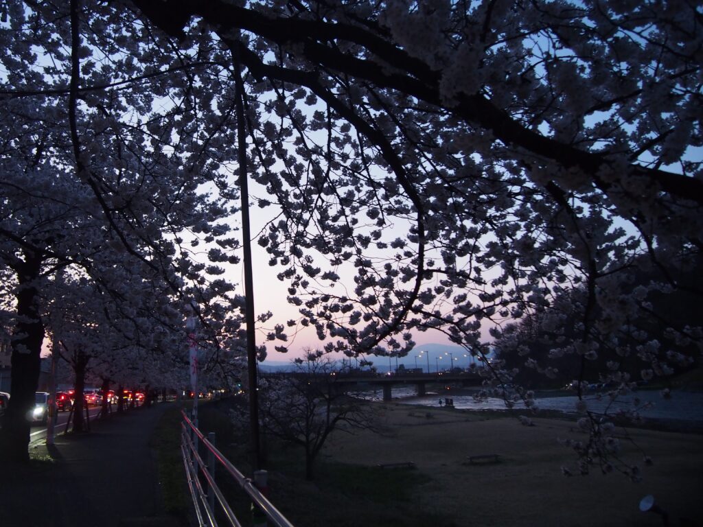 夕焼けを眺めながら20分ほど、馬見ヶ崎川沿いにある馬見ヶ崎さくらラインに到着。