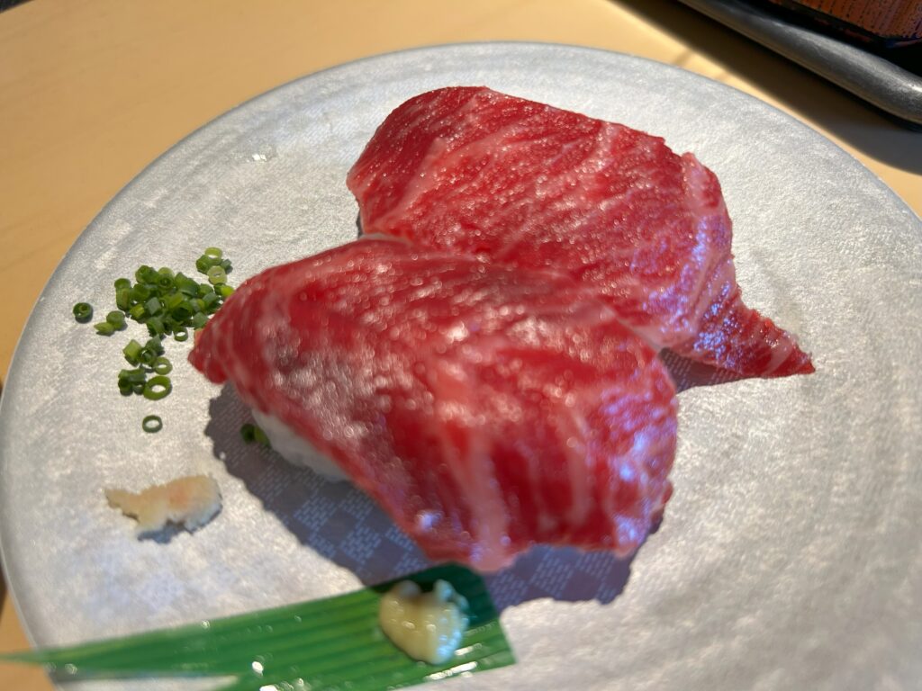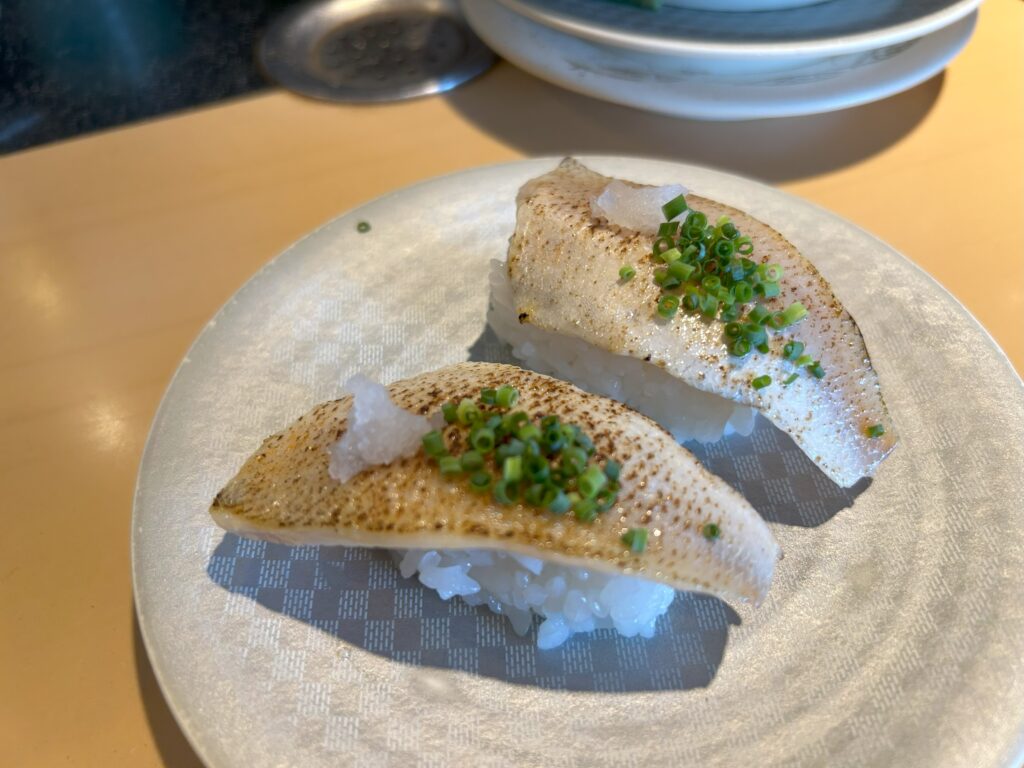 とらふぐのネタ越しに見える青ネギと、紅葉おろしが鮮やか。シーズン的には少し早いけど、やっぱり美味しい。